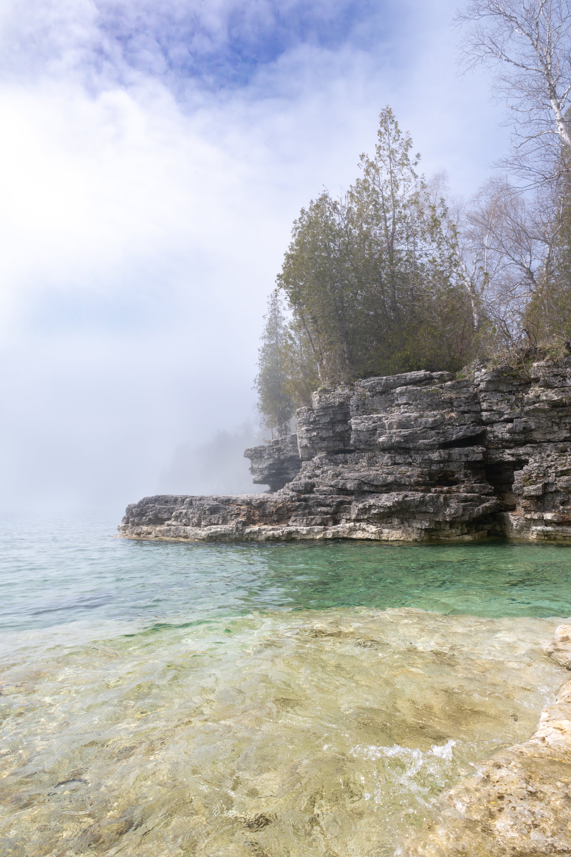 Door County’s eastern edge feels suspended between elements—solid rock and shifting air, ancient stone and water that never stops moving. This is Cave Point when the fog drifts in and softens the line between sky and shore. The cliffs that have faced every storm of Lake Michigan seem almost to exhale here, wrapped in quiet.