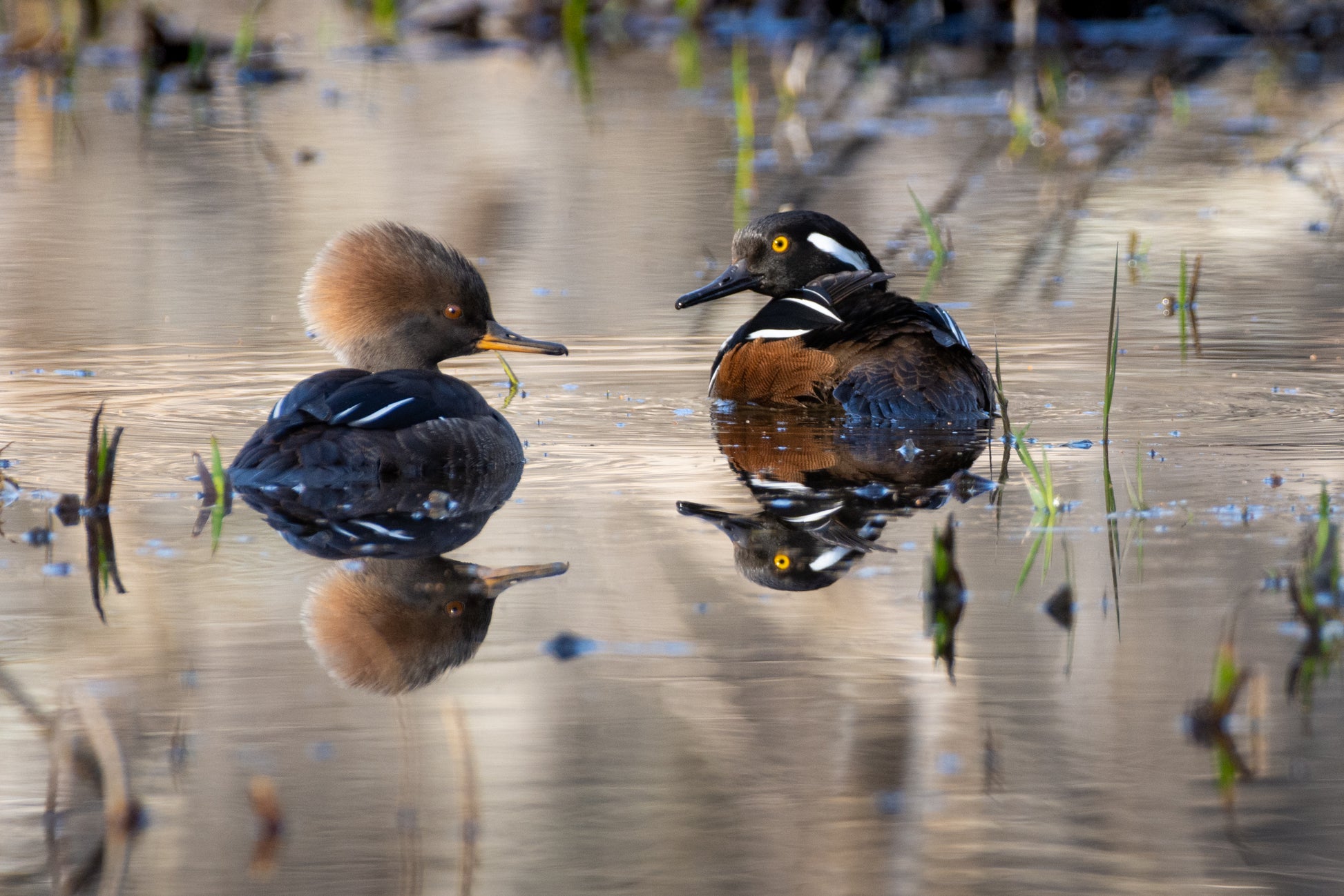 Hooded mergansers are among the more secretive waterfowl of the region, favoring secluded ponds and slow-moving waterways like Anderson Pond. The male, with his striking black-and-white crest and piercing yellow eyes, cuts a bold contrast against the still water, while the female’s warm brown plumage and wispy crest create a more understated beauty. Mergansers are diving ducks, built for chasing small fish, aquatic insects, and crustaceans beneath the surface. Their thin, serrated bills act like built-in fishhooks, making them highly efficient hunters.