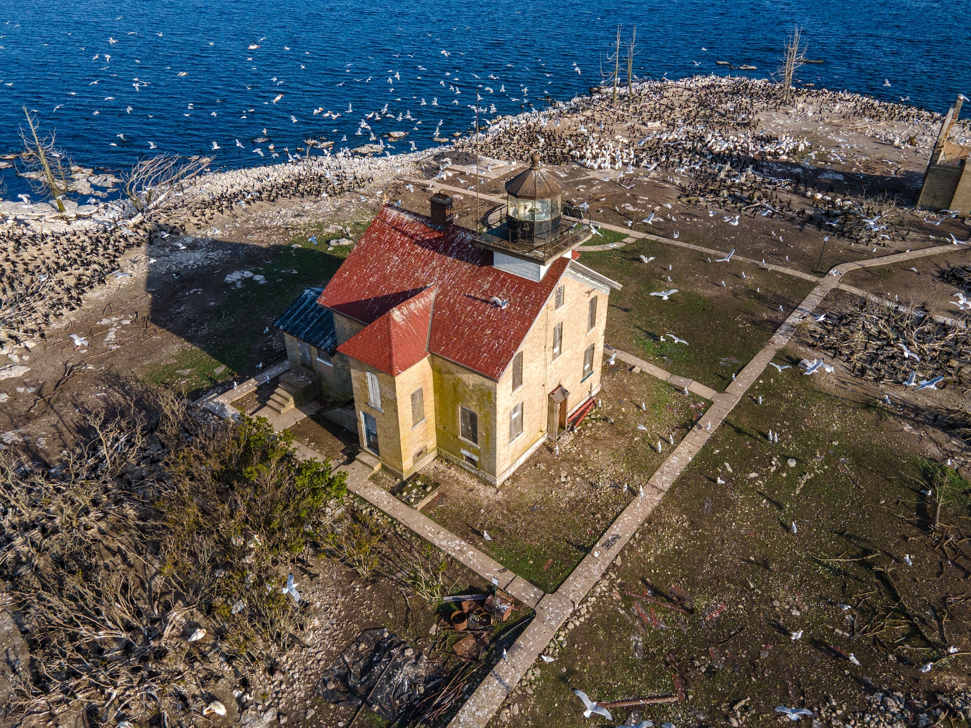Today, Pilot Island is at the center of ongoing restoration efforts led by the Friends of Plum and Pilot Island. However, reclaiming the island from the forces of nature is no small task. Over the decades, large colonies of double-crested cormorants and herring gulls have taken over, their acidic droppings killing nearly all vegetation and bleaching the island’s rocky terrain. Once-thriving trees now stand as skeletal remains, their branches crowded with nesting birds. The ecosystem has further shifted with the presence of northern water snakes, which thrive in the absence of natural predators, slithering among the ruins in search of fish and eggs.