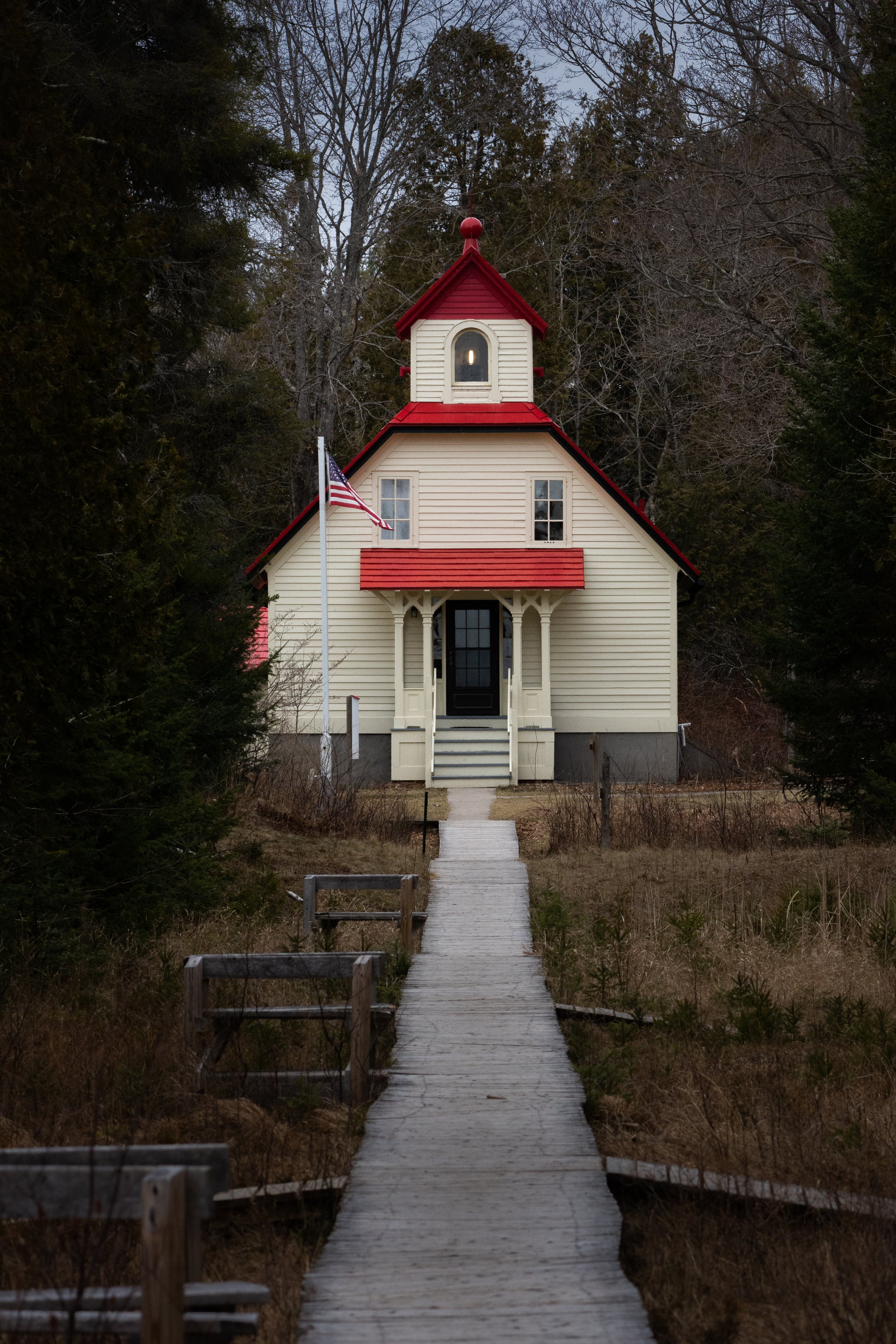 A narrow boardwalk winds through the quiet, untamed landscape of Baileys Harbor, leading the eye toward the North Range Light, its red roof and glowing lantern standing in soft contrast against the deep greens and browns of the forest beyond. The scene carries a sense of solitude and resilience, a reminder of the countless sailors who once relied on this modest structure to guide them safely to shore. Today, the range light remains a steadfast presence, its carefully restored facade echoing the past while standing firm against the ever-changing elements of Lake Michigan. Though the waters may seem calm now, history tells of a time when this harbor was not so forgiving—a time when the need for reliable navigation meant the difference between safe passage and disaster.