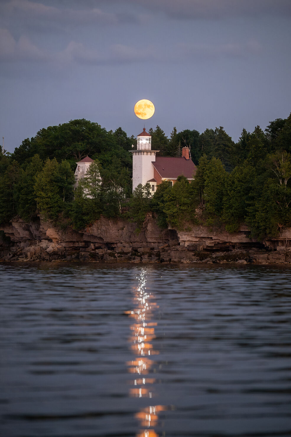 As I drifted past the lighthouse, I cut the motor and floated. The reflection of the moon stretched across the water until it met the beam from Sherwood Point Light, and for one brief moment they fell perfectly in line. A shift of only six inches changed everything, breaking the connection and then bringing it back again. That was the shot. I didn’t chase it — it found me.