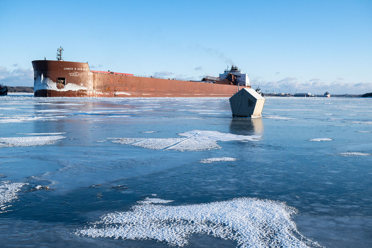 Out near the ships, the M/V James R. Barker was arriving for winter layup, assisted by the Coast Guard cutters Mobile Bay and Mackinaw. Another large freighter had come in before it, and together they worked carefully into position as the ice cracked around their hulls. Each movement sent a tremor through the bay, the sound carrying across the surface in strange, bending tones. The ice flexed and sang like a sheet of aluminum being struck, producing that deep, resonant booiiinggg that seems to come from everywhere at once. It is a sound unique to frozen bays, caused by the ice sheet vibrating under stress, high frequencies racing across its surface faster than low ones. The noise feels alive, like the bay itself is groaning and finding its voice in the cold.