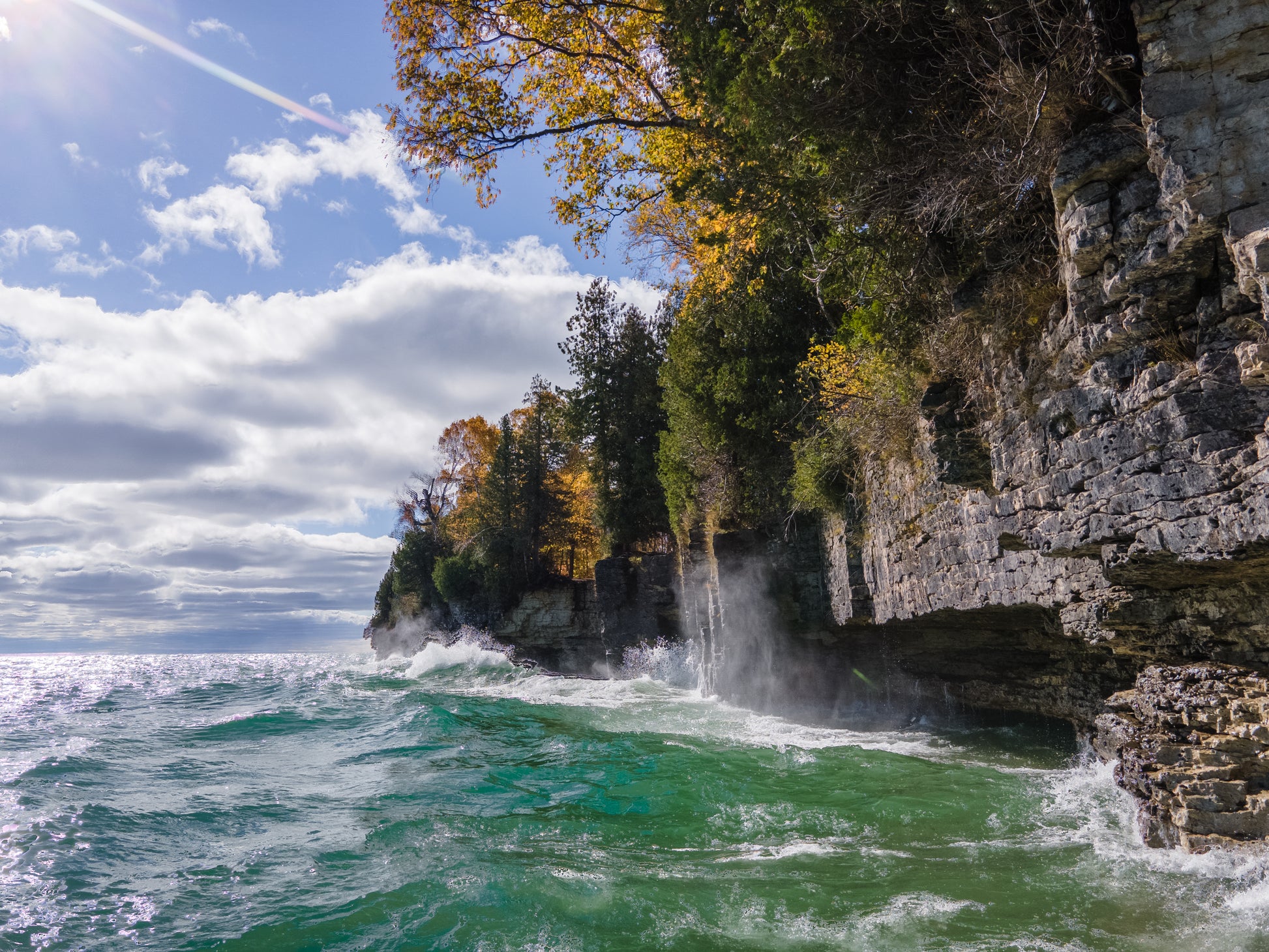 Few places in Door County capture the raw energy of Lake Michigan quite like Cave Point. Here, limestone cliffs stand defiant against the relentless waves, their rugged faces shaped by centuries of wind and water. In this moment, the lake surges forward, sending white-capped waves crashing into the rock, their impact releasing a misty spray that catches the autumn sunlight. The turquoise waters swirl with restless motion, a stark contrast to the warm hues of the forest above. Gold and amber leaves cling to the trees, signaling the onset of peak leaf season, a fleeting spectacle when Door County’s hardwoods erupt into color before winter’s hush sets in.